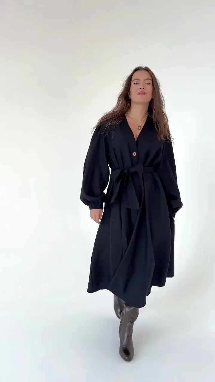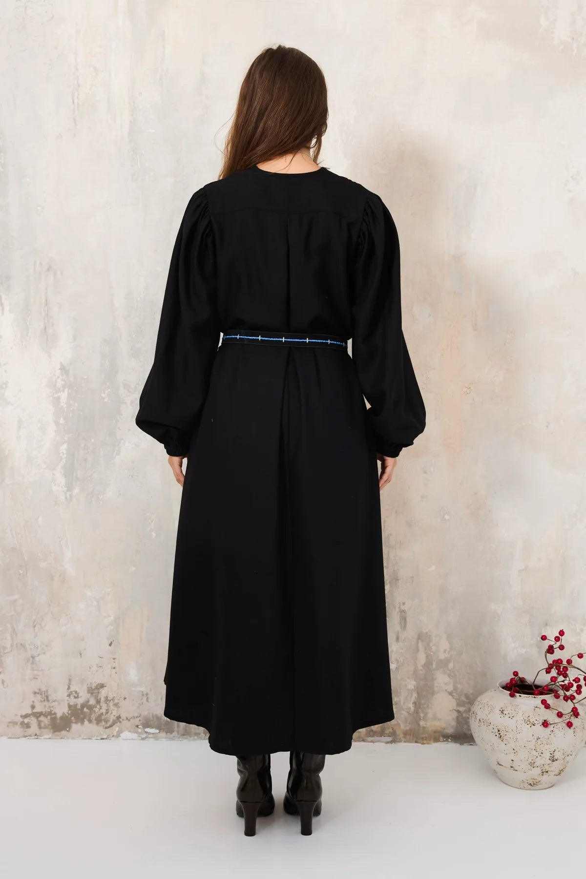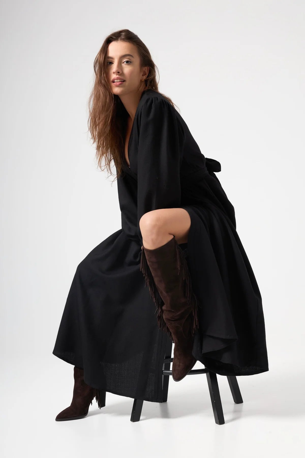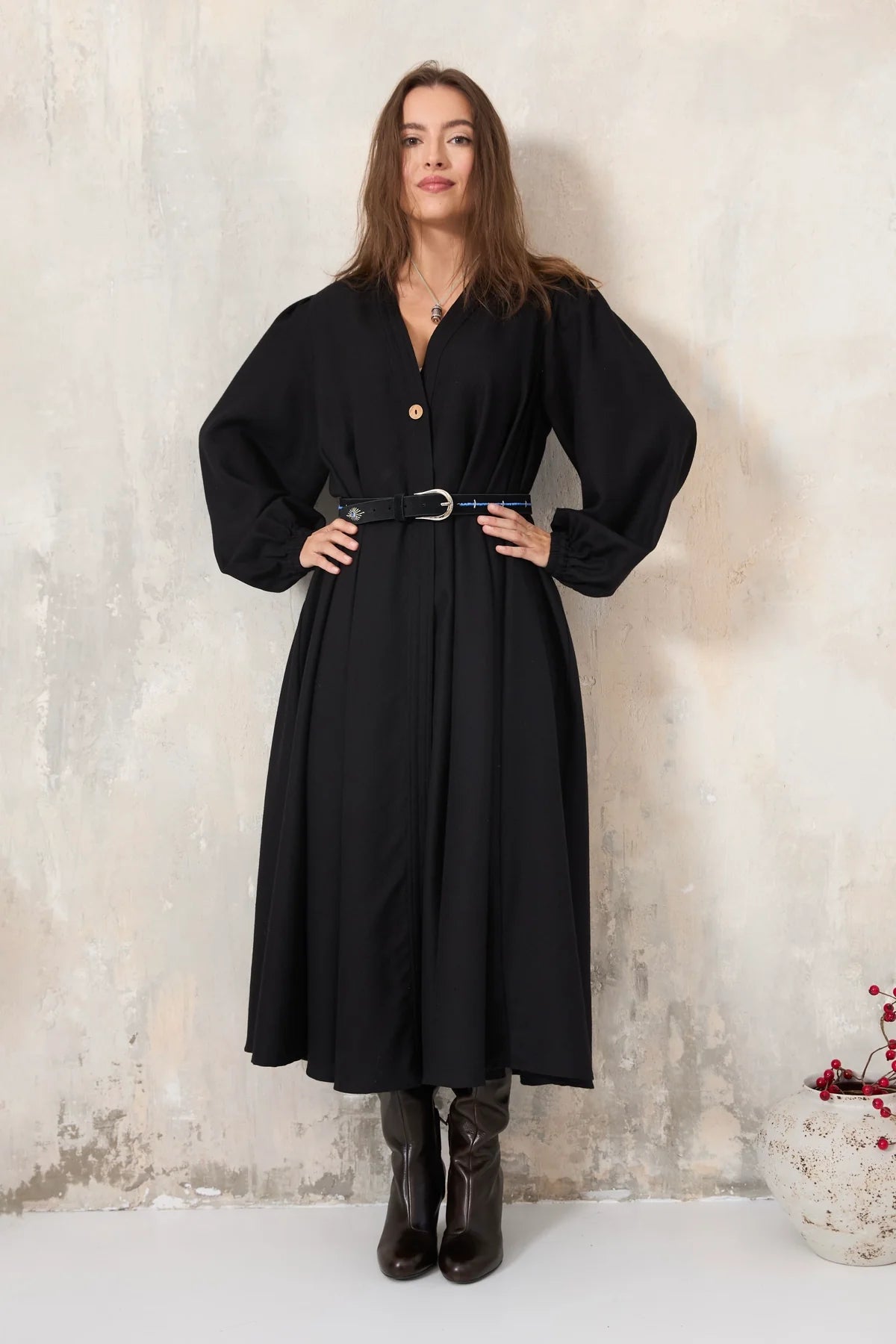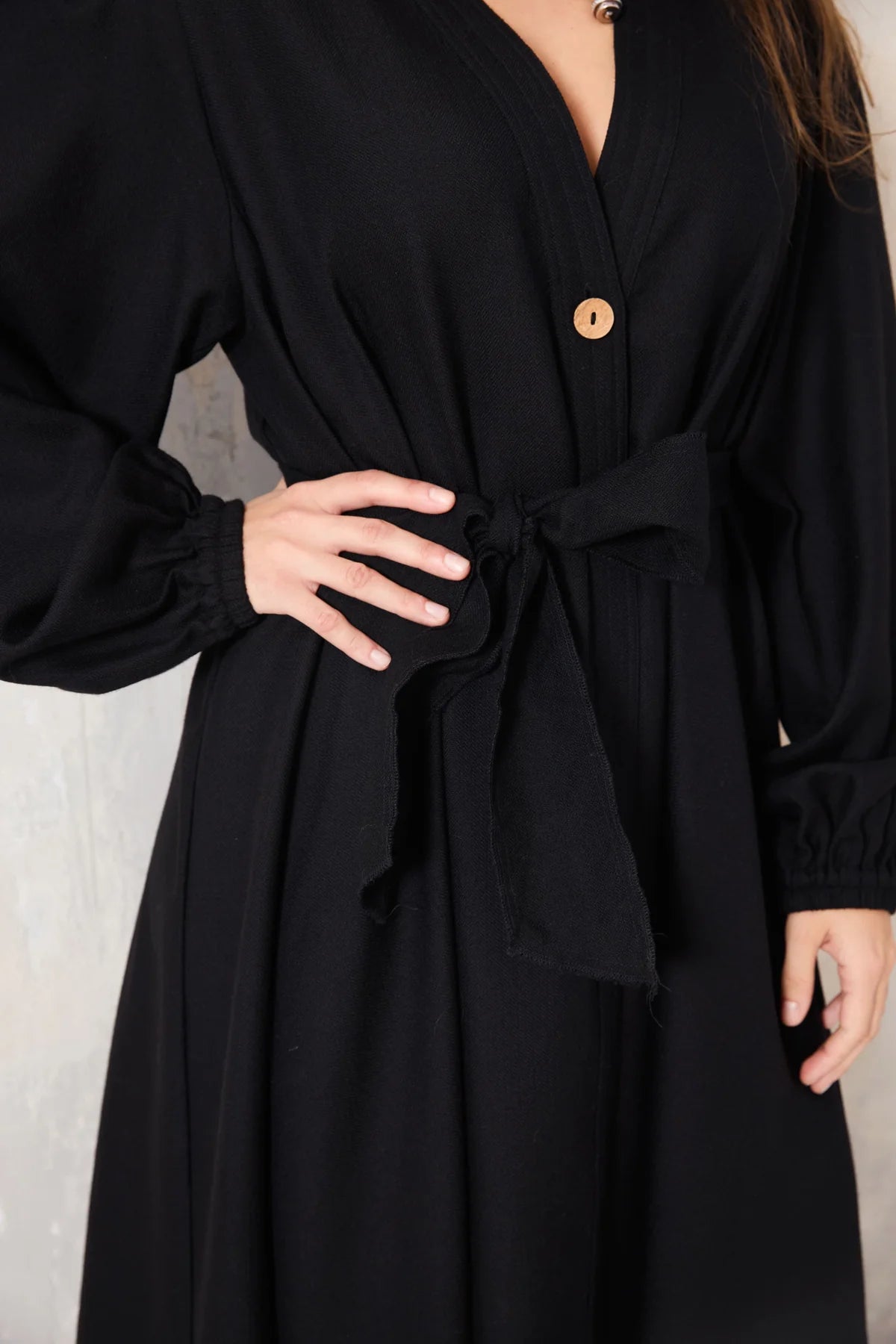 Scopri l'abito Diana, un abito lungo e avvolgente che unisce eleganza e un tocco bohémien. I suoi bottoni in cocco riciclato aggiungono un tocco naturale e unico, mentre la cintura rimovibile accentua con charme il punto vita. Realizzato in morbida e calda lana vergine, ti avvolge nel comfort senza rinunciare allo stile. Perfetto per mixare e abbinare i look, questo abito nero è un must-have per un look chic ma casual.