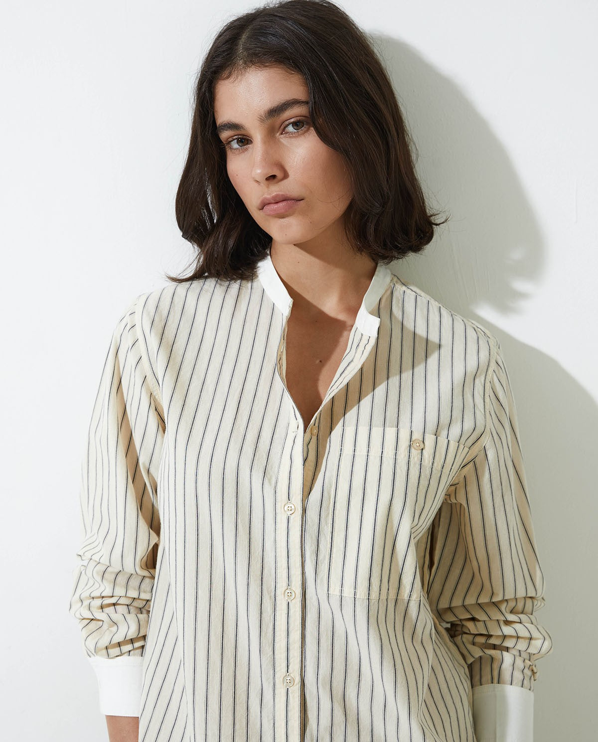 Camicetta in 100% cotone.  Stampa a righe.  Collo di Mao.  Maniche lunghe.  Bottone sui polsini.  Bottoni in madreperla.  Tasca applicata sul petto.  Rifiniture a contrasto sul colletto.  Composizione: 100% cotone. La modella è alta 175 cm e indossa la taglia S.   MATERIALI:  Gli articoli in cotone sono morbidi, traspiranti, assorbenti e ipoallergenici, per una vestibilità fresca e confortevole.