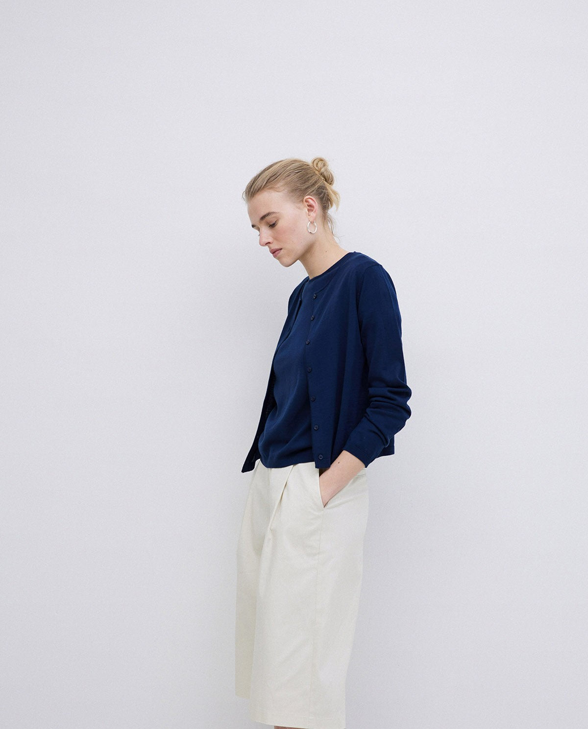 Taglio dritto. Scollo rotondo. Maniche lunghe. Chiusura con bottoni. Dettagli a coste.