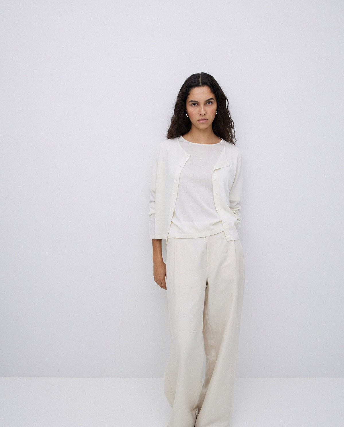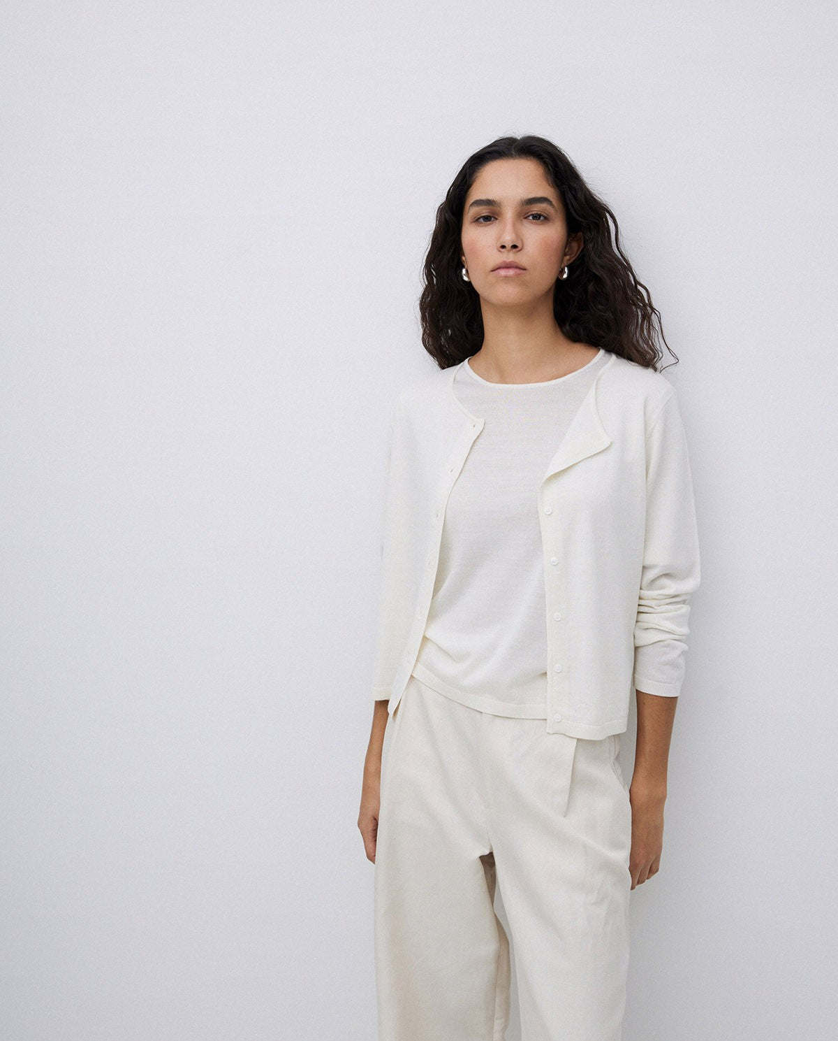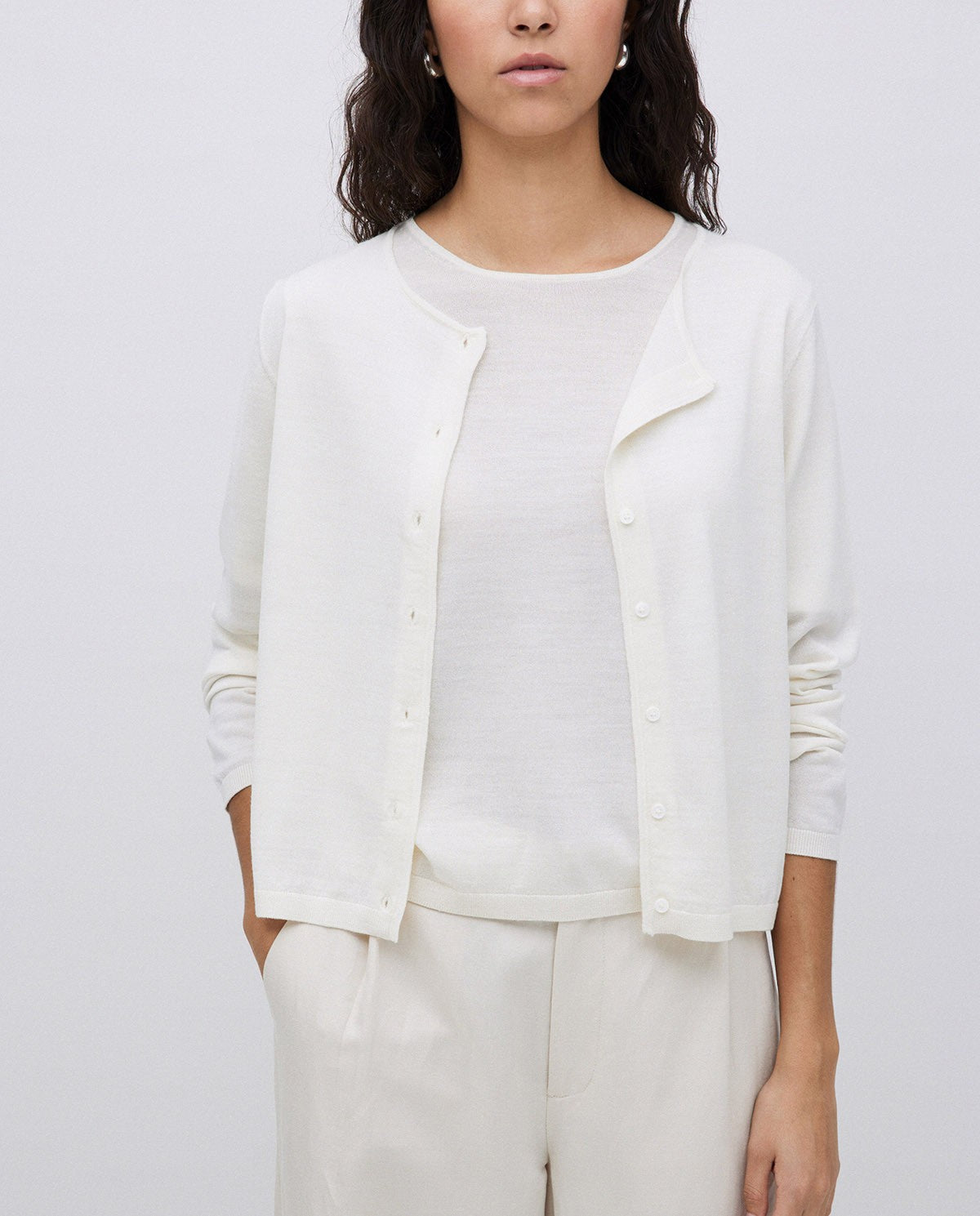 Cardigan in 100% lana merino. Taglio dritto. Scollo rotondo. Maniche lunghe. Chiusura con bottoni. Dettagli a coste.  Composizione: 100% lana merino.  La modella è alta 175 cm e indossa la taglia S. MATERIALI: La lana merino si distingue per la sua particolare delicatezza e morbidezza, nonché per le sue eccellenti proprietà termiche.