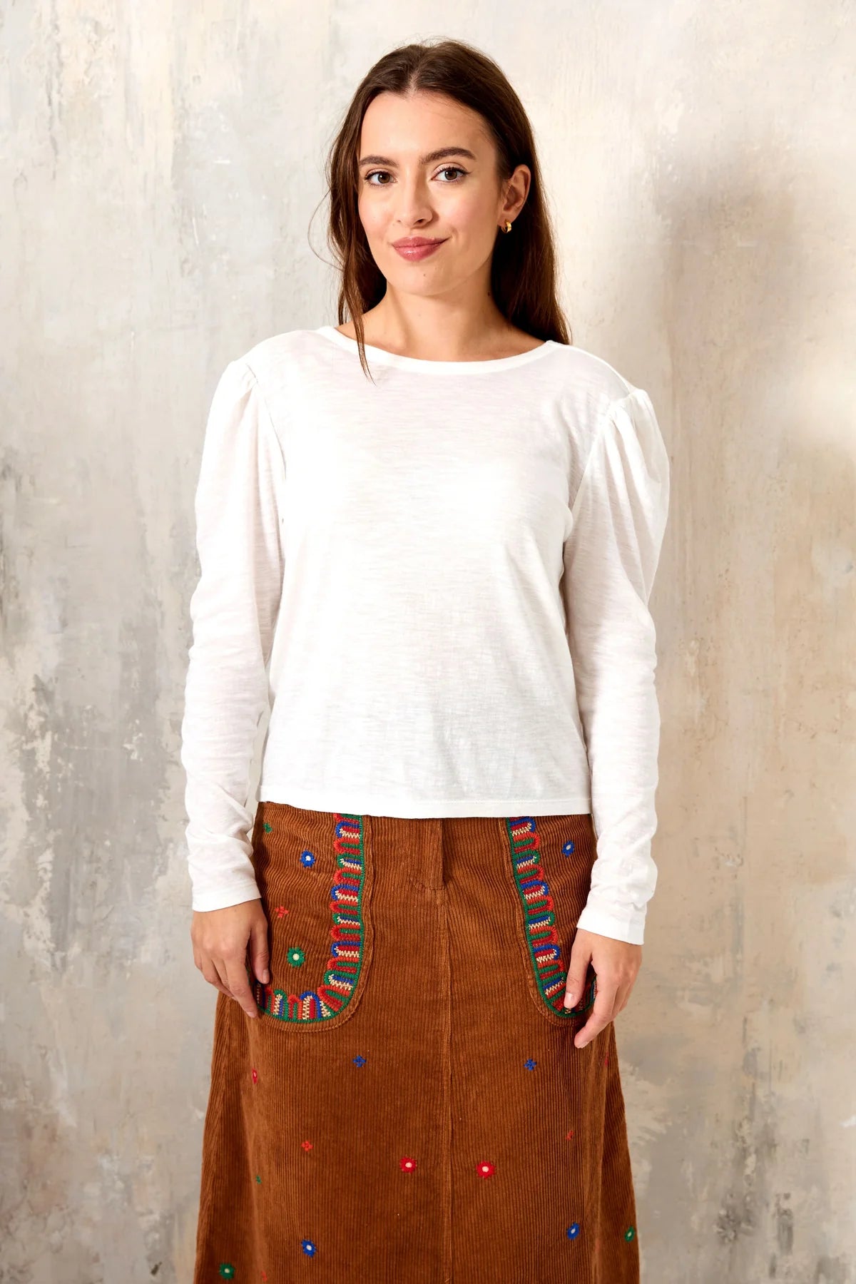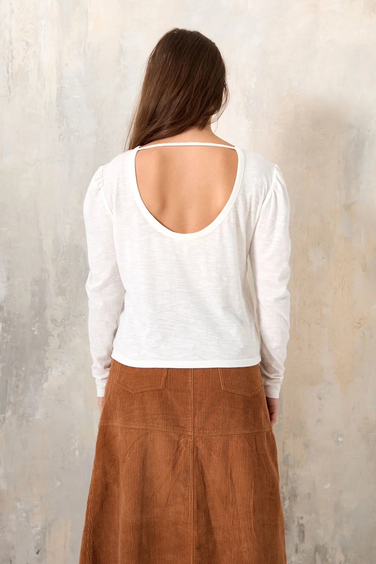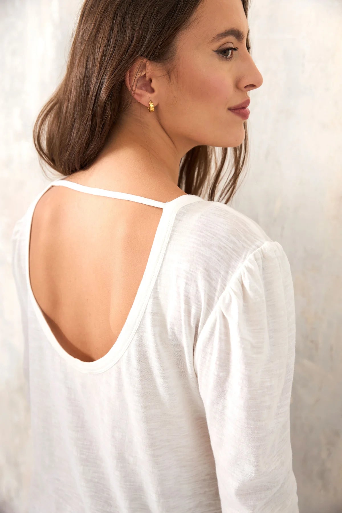 Aggiungi un tocco di comfort ed eleganza al tuo guardaroba con la T-shirt HARPER. Realizzata in flanella di cotone, offre una morbidezza incomparabile. Le maniche lunghe, lo scollo rotondo e l'ampia schiena ti regalano un look femminile e trendy. Le spalle arricciate aggiungono un tocco di raffinatezza a questa T-shirt bianca.