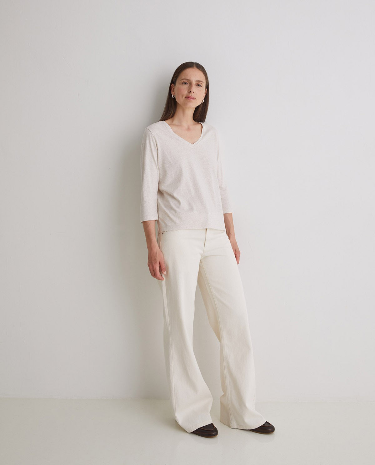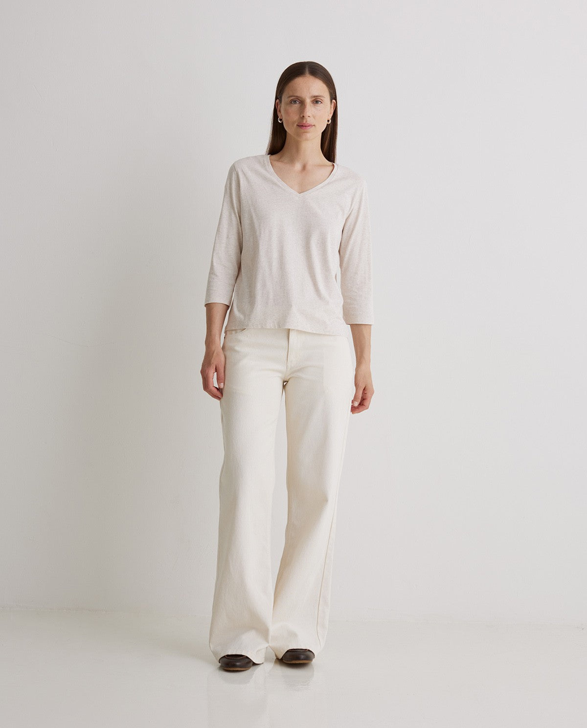 T-shirt in 100% cotone biologico. Vestibilità regolare. Scollo a V. Maniche a 3/4. Ricamo.  Composizione: 100% cotone biologico.La modella è alta 175 cm e indossa una taglia S. Il cotone biologico è coltivato senza pesticidi o fertilizzanti chimici, il che lo rende un'opzione più morbida e delicata sulla pelle. È biodegradabile e prodotto in modo sostenibile ed ecologico, riducendo al minimo il suo impatto sull'ambiente.